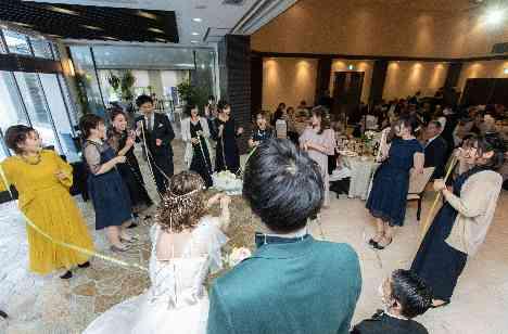 メインソファ席にはたくさんのゲストの皆さまにお集まりいただき、楽しい歓談のお時間を過ごしていただきました。共通のご友人様も多く、懐かしい話に花を咲かせていらっしゃるようでした。おふたりからの幸せのおすそわけをするブーケプルズでは、女性の皆さまで10名早い者勝ちでご案内をし、見事ブーケを引き当てたゲストの方以外にも参加賞としてプレゼントをご準備いただきました。
