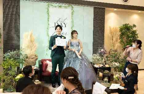 テーブルごとに新郎新婦様の似顔絵を描いていただき、新郎賞と新婦賞それぞれプレゼントをご準備いただきました。テーブルのメンバーと協力して顔のパーツを1つずつ描いていただき、新郎新婦様にはどのテーブルの似顔絵かわからない状態での選出でした。パーツを描くごとに新郎新婦様を見つめるゲストの皆さま。どのテーブルも心のこもった似顔絵になり、形に残る思い出となりました。