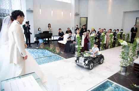 新郎新婦様の大切なリングは、新婦様の甥っ子様が乗ったベンツのラジコンカーで登場いただきました!ゲストの皆さまも驚きの声をあげていらっしゃり、たくさんの声援と笑顔いっぱいの中、とっても可愛らしい入場となりました。無事リングを届け終えた後はラジコンカーも装飾として新郎新婦様の近くで見守ってもらいました。
