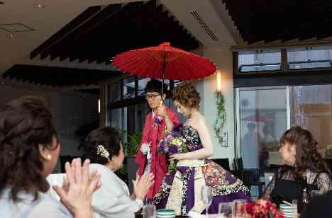 お色直し後は、新郎様は真っ赤な紋付袴姿に新婦様はとっても艶やかな和ドレスに番傘を持っての和洋スタイルでご入場でした。紋付袴と和ドレスという和洋が混合したスタイルにゲストの皆さまもとても驚かれているようでしたが、新しい形の組み合わせがとても良くお似合いでゲストの皆さまがあっと驚くサプライズ感のあるご入場となりました。