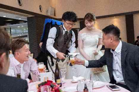 ビールサーバーを背負ってのテーブルラウンド。お酒がお好きなご友人様も多いことから、新郎新婦様自らビールサーバーとおつまみを持ってテーブルをまわっていただきました。実はこの演出は披露宴一番はじめの入場の際に行ったもの。扉が開くとビールサーバーを背負った新郎様のお姿が見え、会場中がサプライズに驚き、とても盛り上がりました。