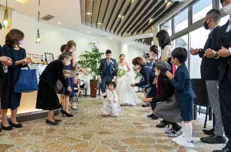 リングガールにも立会人にも、もちろん新郎新婦様の大切な愛娘Kちゃんにご登場いただきました。Kちゃんのかわいらしい姿にゲストの皆さまも思わず笑顔になり、和やかでアットホームな挙式となりました。フラワーシャワーでは新郎新婦様を先導するように前を歩いてくれたKちゃん。その堂々たる姿に、またたくさんの笑顔が溢れました!