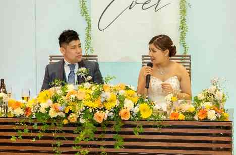 ゲストの皆さまを代表して4名様にインタビューをさせていただきました。サプライズで指名をされたゲストの方は驚いた様子でしたが、たくさんのお祝いの言葉やおふたりとの思い出をお話しいただきました。親御様も知らなかったエピソードなど皆さまにも、新郎新婦様の知らない一面を新たに知っていただくお時間となりました。