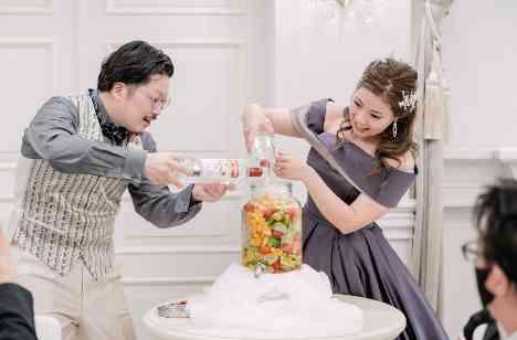 各テーブルのゲストの皆様には色とりどりのフルーツが配られ、お二人がそのフルーツをドリンクサーバーで回収していきます。全てのフルーツが詰まったサーバーにはお二人の大好きなお酒が注がれていきました!結婚式が終わっても式のことを思い出しながら飲むお酒はいつもの何倍も美味しいだろうなあと思いながら実現したお二人らしい演出でした。