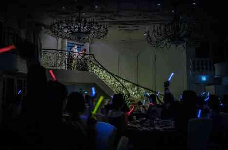 お色直しで中座されたお二人。ここからはいよいよ披露宴の第2幕が開始です!いろいろなドレスがある中で、ご新婦様の選んだ色はグレージュパープル!!!ゲストの方の盛り上がりも最高潮となり、各テーブルに自作のポーズカードをもってラウンドしていきました。様々なポーズで撮影するなか、ご新郎様側のゲストは盛り上がりのあまりポーズがそろわないという楽しい時間も。沢山の人に支えられていることを実感したお二人でした。