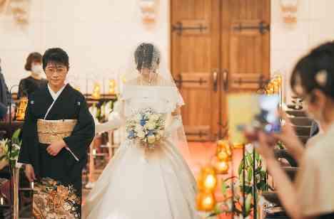 お母様からベールダウンをして頂き、ご一緒にバージンロードをお歩き頂きました。 バージンロードはお生まれになってから成長していく過程を表していて たどり着く先にご新郎様が待っています。そこまでお母様と腕を組み、大切にゆっくりと進まれてくるシーンは とても感動的でした。そして周りにはお二人の大切なゲストがあたたかく見守っていらっしゃいました。