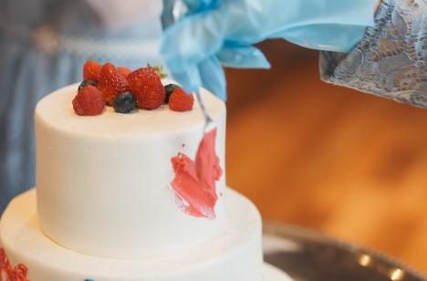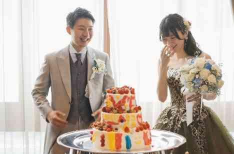 シンプルなケーキが運ばれてきました。実はこちらのケーキはお二人とゲストみんなで創る世界に一つだけのケーキ。お二人が一番上のフルーツを乗せて お色直しの間にゲストが装飾をしていきます。 お色直し後、戻ってきたおふたりの前に、世界で1つのカラフルなケーキが!!お二人からも笑顔がこぼれます。ご協力いただいたゲストの皆様もセンス抜群です!