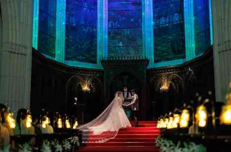 挙式の前にご親族様とのお時間がありました。その中でそれぞれのお父様へご新婦様が感謝の気持ちを込めてブートニアをプレゼントしてつけてくださるセレモニーがありました。ご親族様とあたたかなお時間を過ごされてから挙式がスタート。ステンドグラスの空間が、星空になり幻想的な中、誓いのシーンに。感動的で美しい挙式でした。