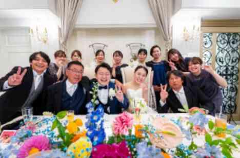 パーティー会場のコーディネートもお二人らしく、鮮やかでカラフルな色合いに。皆様がメインテーブルにお越しになり、お写真を撮影するときも笑顔の花が咲くようでした。 ウェディングケーキはゲストの方々にもいちごを乗せてもらったり一緒に参加型に。感謝の気持ちもお伝えしながらmどんな場面でもお二人とゲストの笑顔が絶えないパーティーでした。