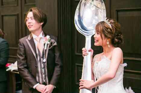 ファーストバイトには新婦からのサプライズで125㎝の巨大スプーンで愛情の分だけすくいご新郎様に食べて頂きました。会場内は大盛り上がり! ゲストにも楽しく笑って過ごしてほしいという希望が叶った披露宴になりました。