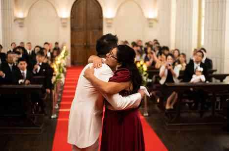 「親御様への感謝が伝わるような挙式にしたい」「こんなにも暖かい家族で育ってきたということをゲストにも知って欲しい」この2つがどうしたら伝わるかをメインに考えていきました。 新郎様はお母様と一緒にバージンロードを歩き、祭壇でラストハグ。新婦様もお父様と歩いてラストハグ。 パパ・ママ いつまでも愛しているよ。