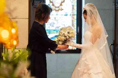 ご新婦様がお父様と入場後、お母様からベールダウンをしていただきました。 その後、ご新婦様を産んでくださったお母様から「とってもきれいだよ。幸せになってね」という想いを込めて、ご新婦様へブーケをお渡しいただきました。