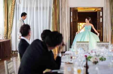 カラードレスを挙式当日まで秘密にしていたご新婦様。 再入場でご新郎様にお披露目をしました。 カラードレスはティファニーカラー! この色を選んだのは、”ティファニーの指輪が欲しい”というご新婦様の夢を叶えてくれたご新郎様の感謝の想いものせて…