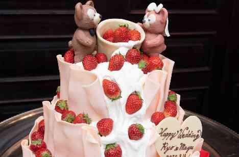 クマが好きなおふたりは、可愛いクマがバケツから苺を垂れ流すケーキをデザイン! ケーキ入場も行い、クマの耳をつけたスタッフが可愛く持ってきてくれました! デザイン通りの仕上がりになり、おふたりもかなり喜んでくださいました♪