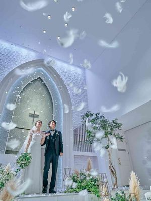 挙式のクライマックスシーンでは高さ8mの吹き抜けより幸せのフェザーシャワーがお2人のもとへと舞い降ります。幾千もの祝福の羽が降り注ぐ瞬間は、感動的な挙式より一層引き立てます。ゲストの皆様へのサプライズ演出となるフェザーシャワーはお2人もご列席者様も、笑顔いっぱいになる印象的なシーンに。