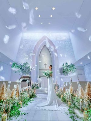 ホワイトを基調にした輝きのチャペルは清らかな花嫁様にとっての最高の舞台!全長15mの煌めきのバージンロードを歩む瞬間は、天へ飛翔するような高揚感!