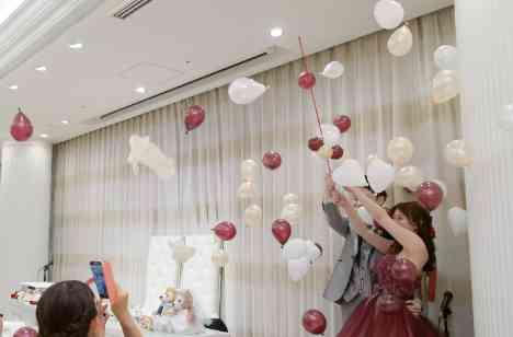 お2人の披露宴の演出のお1つとして ワイン ピーチ ホワイトの三色のお色でバルーンスパークの演出を行いました おふたりが大きなバルーンを割ると披露宴会場に風船が弾けました!ゲストの方々は想像もつかない演出でとてもびっくりされました!! 映えること間違いなしの演出です! 披露宴会場は盛り上がりました♪