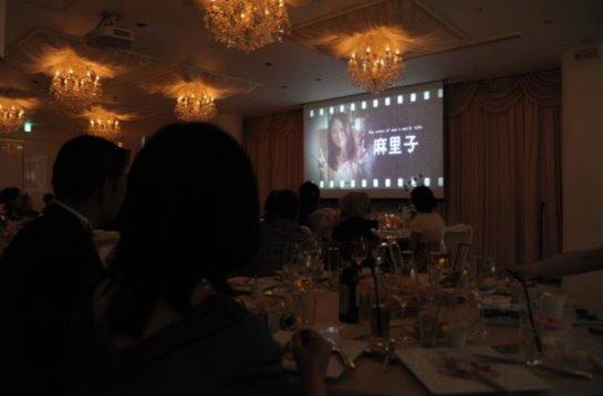 大きなスクリーンを使って生い立ちムービーの上映です。あんな事があったな、こんな写真、いつの間に!そんな思い出にゲストの皆様も思わずスクリーンに注目です。