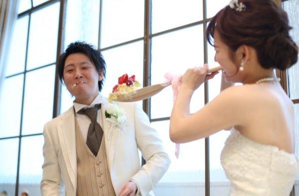 ウェディングケーキといえば、ファーストバイト!ご新郎様はご新婦様のドレスを気遣い可愛らしいスプーン。ご新婦様はビックスプーン!ご新郎様への愛情がたっぷり!