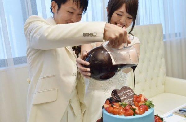 ご披露宴ではケーキ入刀・・・ではなくチョコレートかけてみました!この世に一つしかないチョコミントケーキの完成です!