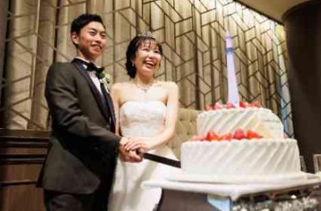 お二人の想い出の場所は東京スカイツリーということで、シンプルなウェディングケーキの上にスカイツリーを乗せてインパクトを🎂 デート当日を想い出すお二人らしいウェディングケーキとなりました。 スカイツリーを光らせてウェディングケーキ入刀のセレモニーを! ばっちりのシャッターチャンスとなりました📷✨