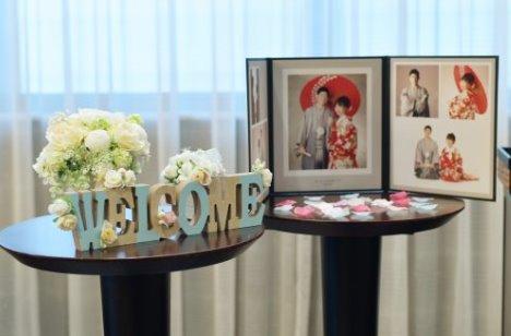ゲストが1番最初に通るラウンジでは 自由に飾り付けができるオリジナルウェルカムスペース。 お母様が自作されたお花のオブジェと 前撮りのお写真で思い出がギュッと詰まった 受付装飾になりました!☆