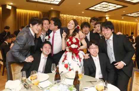 再入場後は各テーブルでのフォトラウンド! 大きな拍手と大きな祝福に包まれ、 思い思いのポーズで撮影! お2人とゲストの皆さまの友情の深さが感じられる1枚ですね☆ 全員と撮影できるフォトラウンドはオススメです
