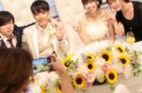 新郎様新婦様と距離が近いので すぐメインテーブルの隣に行って お写真撮って頂けます! お打ち合わせで相談したメイン装花も 綺麗に映っております(^^) ゲストもお二人もとても素敵な笑顔です!