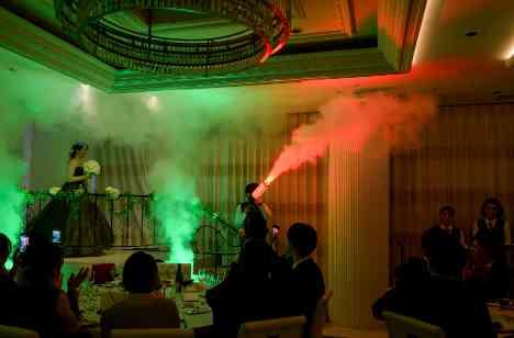 再入場にはカラージェットスモーク&CO2ジェットガンで華やかにに入場!!曲はT.M.Revolutionの【HOT LIMIT】で会場のボルテージは一気に最高潮に!!ザリュクス銀座ではお好きなシーンで自由に曲指定ができるのも当日が盛り上がる秘訣!オペレーターとのお打ち合わせで音楽進行表も作成します。 とってもインパクトのあるシーンになりました。