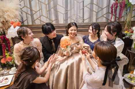 お色直しではご新郎様がご新婦様にサプライズをご用意。 新郎様がゲストから受け取った12本のバラを束ね、愛の言葉とともに新婦に渡す演出です。 「感謝・誠実・幸福・信頼・希望・愛情・情熱・真実・尊敬・栄光・努力・永遠」の意味が込められた12本のバラをゲストから受け取ります。 これまでの人生を共に歩んできた家族や友人に参加してもらうことで、より想いのこもった花束となり一生の思い出となりました。