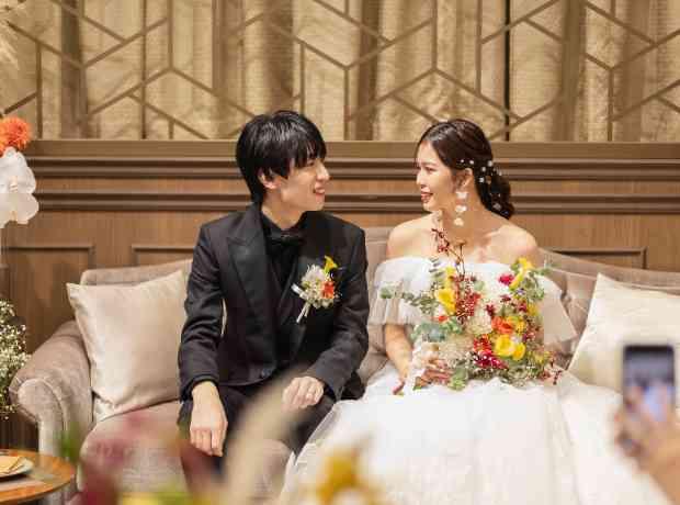 挙式が結び、ウェルカムパーティーでは歓談やお写真タイムをたっぷりと。ゲストとのお時間を長くお過ごしいただきます。 披露宴はソファーのメイン席で。 ゲストとの距離も近く、カジュアルでアットホームな空間づくりにはマストアイテムです。ゲストの皆様が常に近くに オータムウエディングらしい、オレンジをテーマにしたお花たちと差し色のワインレッドが可愛いくお洒落なコーディネートとなりました。
