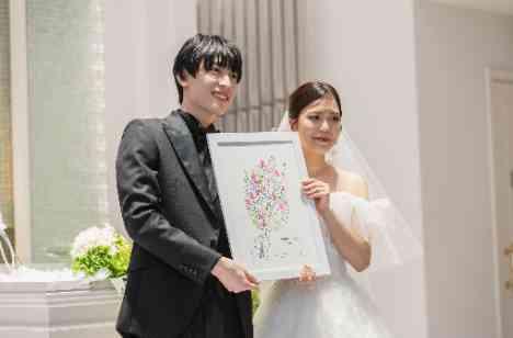 ゲストを立会人として、結婚の誓いを立てる『人前式』を選ばれたおふたり。 結婚証明書も皆様のご参加のもと完成いたしました。 カラフルなスタンプが印象的な結婚証明書は形として想い出に残ります。 他には、ゲストへ小さなBOXをご用意し、合図でゲストがBOXを開け、当たりが入っていた方に指輪を届けてもらう『サプライズリング』演出も行い、 まさにゲストと作り上げる挙式となりました。