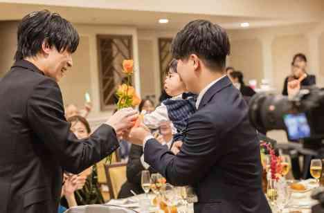 お色直しではご新郎様がご新婦様にサプライズをご用意。 新郎様がゲストから受け取った12本のバラを束ね、愛の言葉とともに新婦に渡す演出です。 「感謝・誠実・幸福・信頼・希望・愛情・情熱・真実・尊敬・栄光・努力・永遠」の意味が込められた12本のバラをゲストから受け取ります。 これまでの人生を共に歩んできた家族や友人に参加してもらうことで、より想いのこもった花束となり一生の思い出となりました。