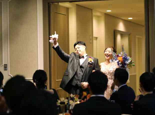 ゲストの皆様とアットホームに過ごすことを大事にしているおふたりは形にとらわれない、カジュアルな『人前式』を選ばれました。ご親族のみの挙式では、笑いが絶えないカジュアルでアットホームな空間となりました。お子様にリングガールをお願いし、誓いの言葉はおふたりらしくカスタマイズ。感謝や絆を大切に、より深く思い出として残るお時間はかけがえのないものとなります。