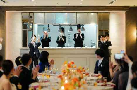 『美しい料理でゲストをおもてなししたい』 直営レストランアノーブが魅了するリュクス自慢の至極のフルコースは会場併設のオープンキッチンから最高のタイミングでご提供。乾杯のご発声と共にBGMが流れ、スタッフが一礼すると…。カーテンが開き、そこには色鮮やかなお料理とシェフが並びます。オープンキッチン演出により、お料理への期待感が高まり、ゲストの皆様は大盛り上がり。出来立てのお料理をご提供いたします。