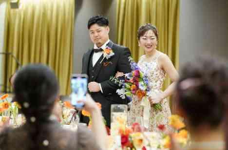 チャペルとイメージがガラッと変わり、『橙』をテーマにした披露宴会場でパーティーを。明るさ、元気、親しみやすさを感じさせる、おふたりにぴったりなビタミンカラーは会場の雰囲気をより幸福でいっぱいとなりました。お色直しはグリッター輝くシンプルなドレスにお召し替え。シンプルなウエディングドレスとイメージを変え、ヘアはアップに動きを出し、ビビットカラーを交えたブーケでよりカジュアルな印象に。