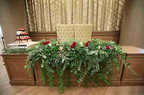 グリーンをたくさん使い、ご新婦様のカラードレスの赤をアクセントにしたお2人のメインテーブルの装花でこだわりの空間に! 会場のナチュラルな雰囲気にたくさんのグリーンがマッチして 素敵な空間となりました。