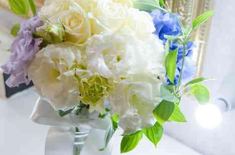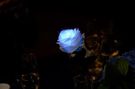 お色直し後 各卓1本ずつグレイスローズを渡しながら フォトラウンドを致しました。 1本はご新婦様のカラードレスと同じブルーに光るバラを。 お2人がメインテーブルについた後に 皆様一斉に花瓶にバラを挿し ブルーのバラのテーブルにはお2人よりプレゼントを。 ゲストの皆様と盛り上がる素敵な時間となりました。