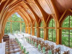 サンタムール教会は、緑に囲まれた自然豊かなロケーションが魅力。大きなガラス窓からたっぷりと光が差し込み、天井高7メートルの開放的な空間が自然光に包まれます。緑と光のコントラストが美しく、神聖で幻想的なシーンを演出します。