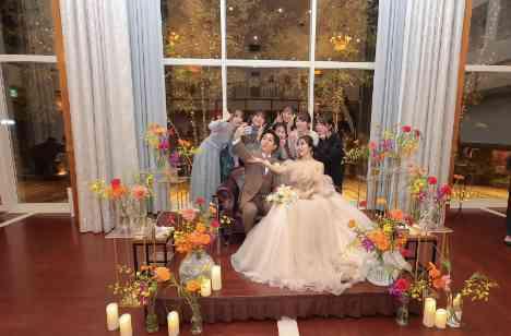ソファ席にしたことでゲストとの距離が近くなり話しやすかったり、写真も撮影しやすかったので良かったなぁと思います。元々使いたかったお花やテーブルクロスの色と会場の色・ウッドな床や照明がマッチして、あたたかみのある会場になったのも良かったです。また天井が高いところも魅力的でゲスト人数90名でしたが、開放的な空間でした。