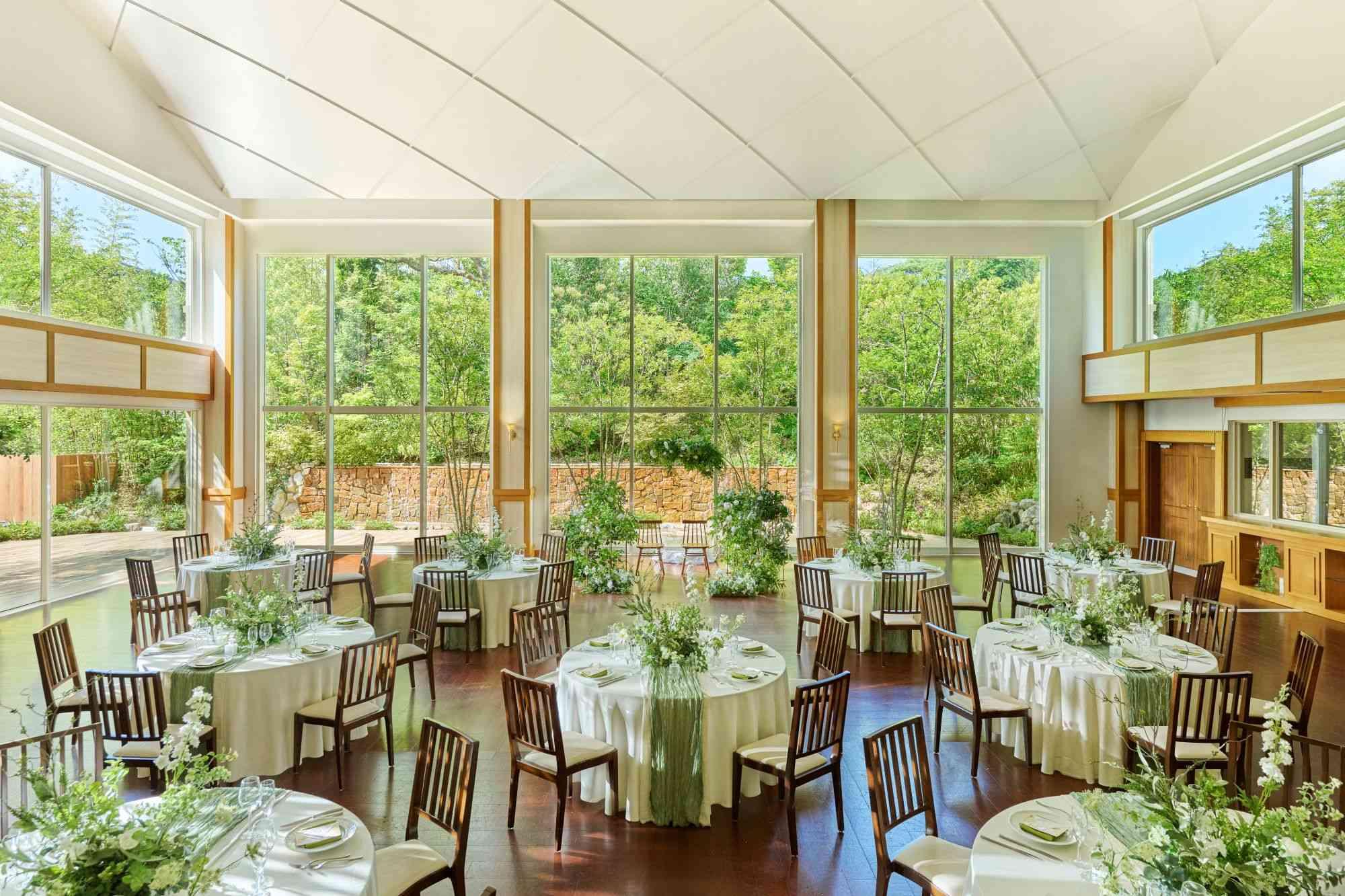 多くの緑に囲まれた会場。天井高6メートル。最大着席人数150名。披露宴会場内にはオープンキッチンが併設されており、出来立ての料理を提供。またテラスもあるのでデザートビュッフェなどの演出もできる。