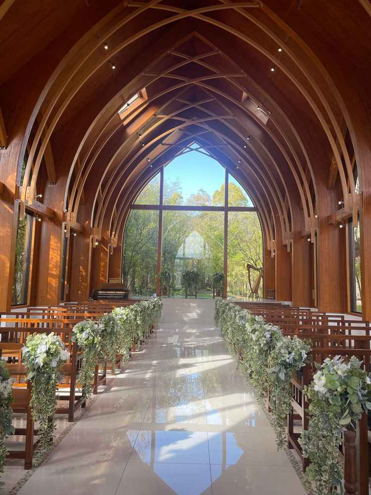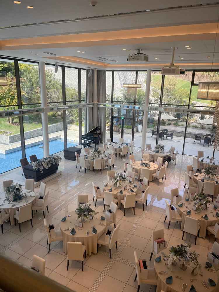 ハウスウェディング形式の会場だったが、それぞれのチャペル、披露宴ごとにテーマが決まっており、会場に入るとだけで特別感を感じられる造りになっていた。水辺の会場はガラス張りであることが特徴的でかなり開放感があった。