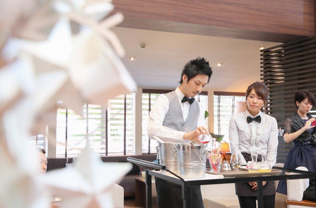 ウェイター&ウェイトレス姿のおふたりがリビングルームでお出迎え♪「なんでふたりがここにいるの!?」とゲストの皆様はびっくり。おふたりがホストになったウェルカムパーティのスタートです!