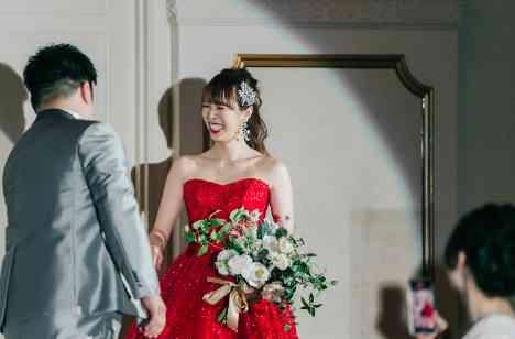 新婦様のドレス姿を楽しみにしてくださっているはゲストの皆様だけではありません。 新婦様のことが大好きな新郎様も楽しみにされているひとり。楽しみにしてくださっている皆様に!と新郎様にもカラードレスを内緒にされていた新婦様がお披露目で選んだはの披露宴会場!新郎様新婦様が別々にご入場・・・新郎様も新婦様のドレス姿にうっとり♪