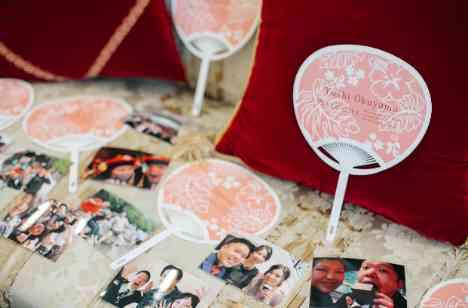 おふたりの結婚式は7月、夏真っ盛り! 暑い中、お越しくださるゲストの皆様に来てよかったと思っていただけるよう夏ならではの雰囲気に仕上げたいという想いがありました。会場の色味などだけでなくアイテムもこだわりたい!ということで手作りの”うちわ席札”を準備。お越しいただいた方が最初から夏を感じていただけるように準備をし、季節感・統一感をだしました。