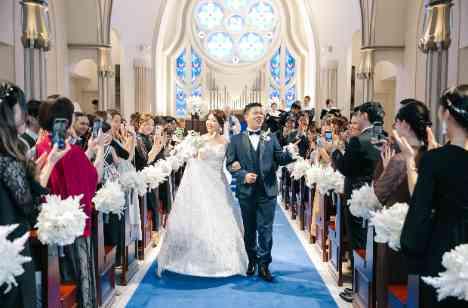 新婦様が選んだウェディングドレスは細かな刺繍やスパンコールが散りばめられたこだわりの1着。約1000種類の中から選び抜いたドレスです。その姿を親御様や親族様はもちろん、ゲストの方は楽しみにされております。 青のバージンロードに加え、新婦様の動きに合わせ動くスポットライトが新婦様をよりきれいに、美しく。花嫁姿を際立たせます。