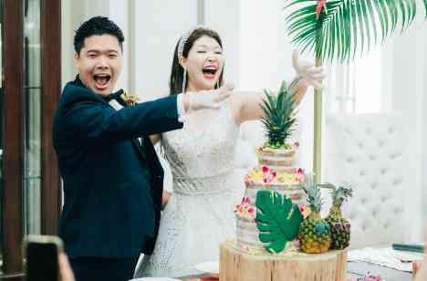 皆様の印象に残る&私たちらしい演出がしたい!と思ったおふたり。担当のウェディングプランナーとパティシエと一緒に考え、実施したのが”フラワードロップ”。ケーキ入刀セレモニーに変わりにエディブルフラワー(食用花)を仕上げに散りばめる演出。音楽までこだわりことで笑顔と歓声が。鮮やかビタミンカラーのエディブルフラワーがキレイですね。