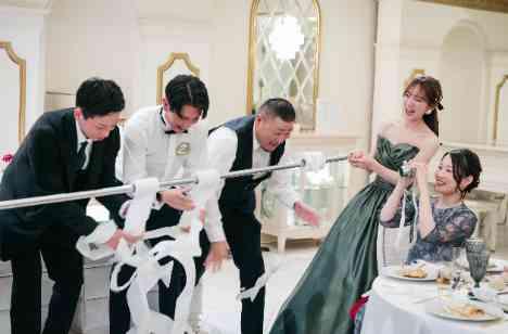 披露宴の演出では、トイレットロールの早巻き選手権をやりたい!と意気込んでいらっしゃったおふたり。 やはりみんなで笑顔になる時間をたくさん創りたいという想いと ご家族にも友人と楽しんでいる姿を見て安心してもらえたらという想いもあったとのこと。 当日はおふたりが描いていた通りゲスト全員の笑顔が溢れ、大盛り上がりの演出でした。