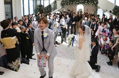 フラワーシャワーの入場では巨大クラッカーを発射!!ゲストの皆様も巨大クラッカーの迫力に大盛りあがりでした。新婦様はブーケをサプライズでご友人にプレゼント。ご友人は驚きと感動で涙を流されていました。さらにゲスト全員が参加できる、【うまい棒】トスと当たり付きのお菓子まきを行ない、ゲストの皆様から自然と笑顔が溢れる楽しいひとときとなりました。