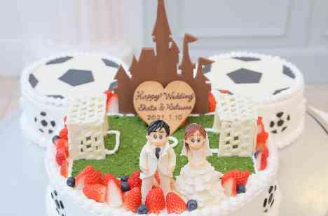 サッカーと大好きなキャラクターの世界観でまとめあげたおふたりこだわりのコーディネート!特にウエディングケーキはサッカーボールとサッカーフィールドをメインにした世界にひとつしかないオリジナルケーキを作成!インパクト大な存在感にゲスト様も次々とお写真を撮られていらっしゃいました。もちろん、お写真映えもばっちりです♪
